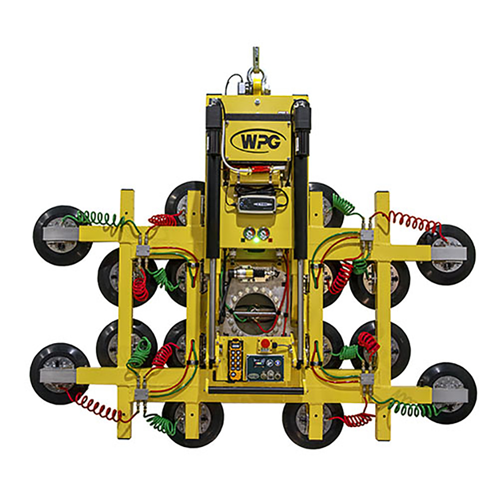 This lifter features a large capacity, powered tilt, and can be ordered with an integrated counter-balancer that keeps heavy loads from tilting forward. A curved glass version is also available. To prevent accidental releases, an integrated weight sensor stops the lifter from detaching from unsupported loads.